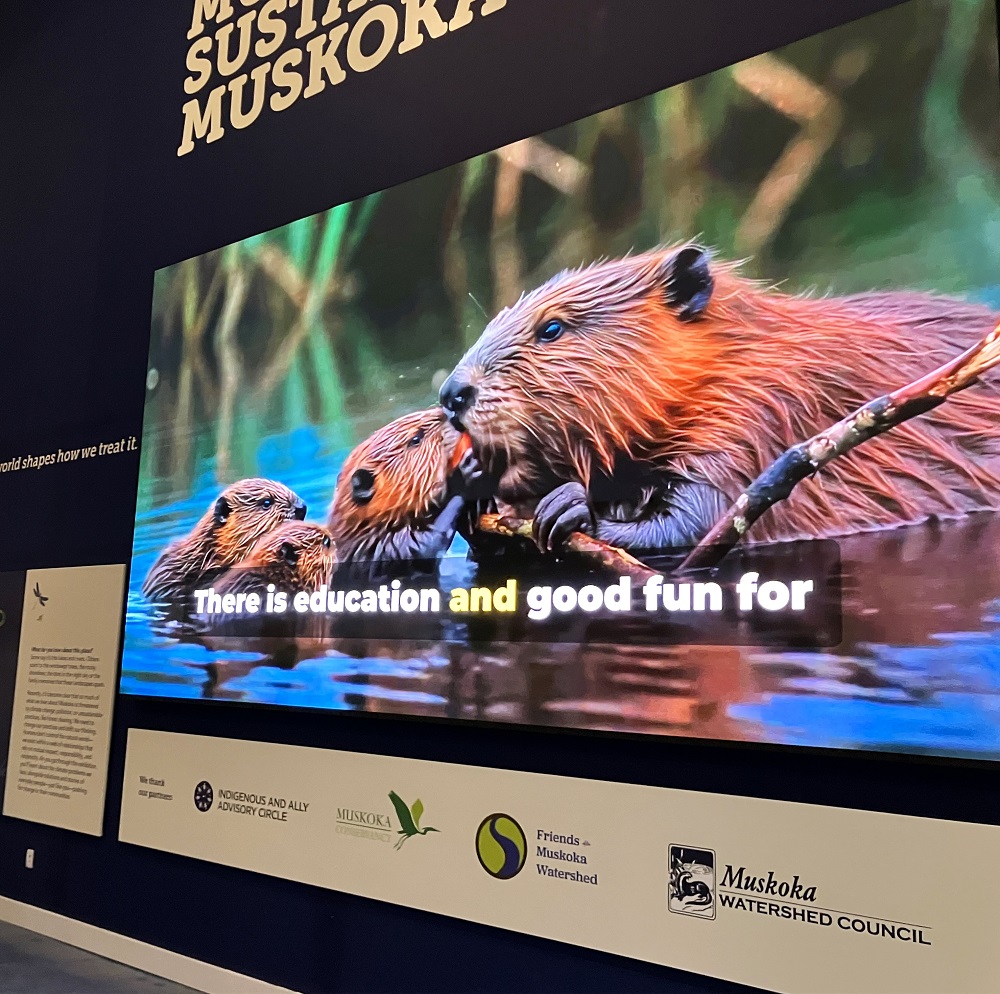 A huge new 9-foot by 15-foot screen is part of the climate display with amazing AI images of beavers and other Muskoka wildlife sharing the lakes with local residents and the impact changes have on the world we live in.