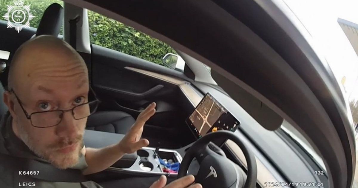 Paul Lipscombe is detained by Leicestershire Police in his white Tesla (Picture: Leicestershire Police)