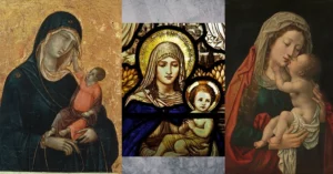 L to R: Madonna and Child, Duccio di Buoninsegna, c. 1290–1300, Metropolitan Museum of Art, New York City; stained glass of Mary and Jesus, Davenham Church, Cheshire; The Virgin and Child, Bernard van Orley, c. 1520-1530, Rijksmuseum