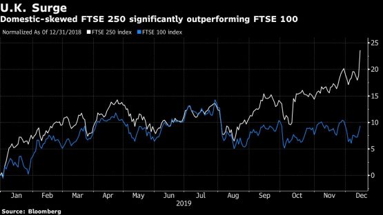 UK domestic stocks surged after the Conservative Party’s election victory lifted the uncertainty that has persisted since the country voted to leave the European Union and removed concern about the Labour Party’s plans to nationalise assets.