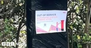 This postbox in Bangor says “out of service, automated system coming soon” [BBC]